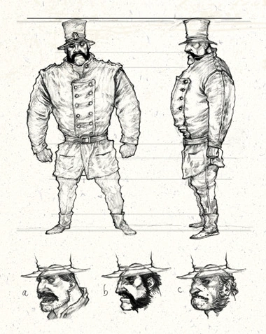 Policjanci są bardzo muskularnymi mężczyznami ubranymi w ciemne mundury ciasno spięte paskiem. Posiadają wysokie kapelusze.