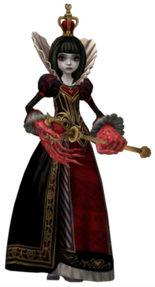 - В Alice: Madness Returns подразумевается, что Королева может являться воплощением умершей сестры Алисы Лиззи. Люди часто путали её с Алисой, когда она была маленькой девочкой. Но в детстве Алиса носила волосы до плеч и без чёлки. Артбук раскрывает, что внешность Королевы должна напоминать внешность Алисы Лидделл – прототипа героини «Приключений Алисы в Стране Чудес», которая в детстве носила короткую стрижку и прямую чёлку.