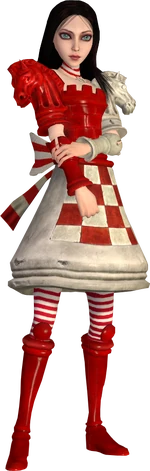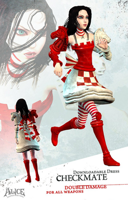 The Checkmate dress is a chess-inspired costume of Alice Liddell that appears as DLC. The dress' in-game effect is the double damage for all her weapons.